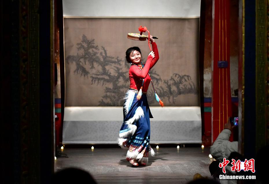 12月23日晚,西藏拉薩吉本崗藝術(shù)中心舉行吉光之夜活動。朗瑪堆諧、扎木念彈唱、熱巴舞等非遺展演,吸引眾多民眾共同領略西藏非物質(zhì)文化遺產(chǎn)的無窮魅力。圖為熱巴舞《太陽鼓舞》。中新社記者 李林 攝