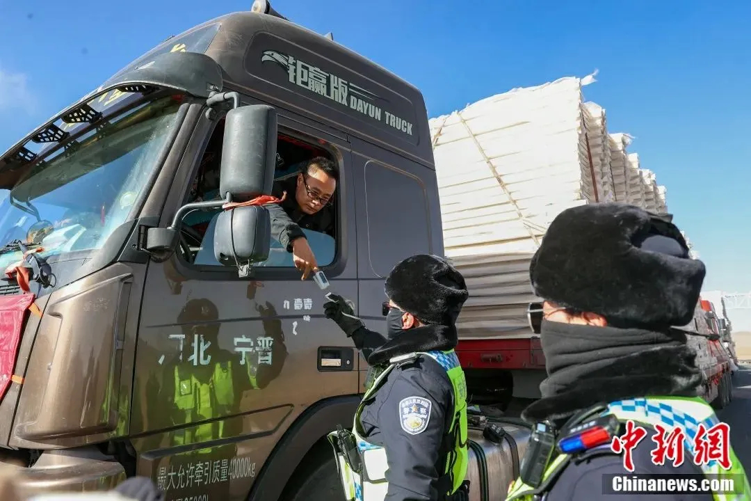 圖為交警對貨車檢查后敬禮放行。中新社記者 貢嘎來松 攝