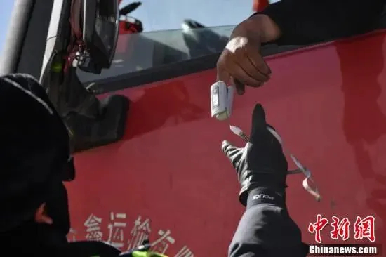 圖為交警為貨車司機(jī)測量血氧。中新社記者 貢嘎來松