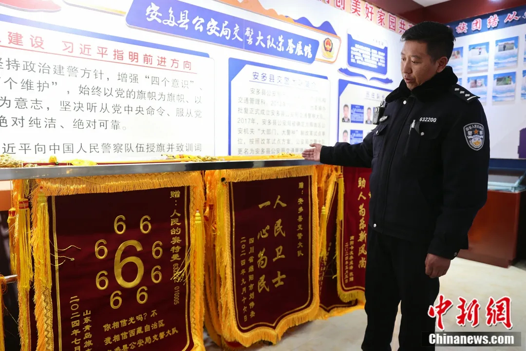 圖為安多縣交警向記者展示多年來獲贈(zèng)的部分錦旗。中新社記者 薛蒂 攝