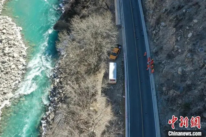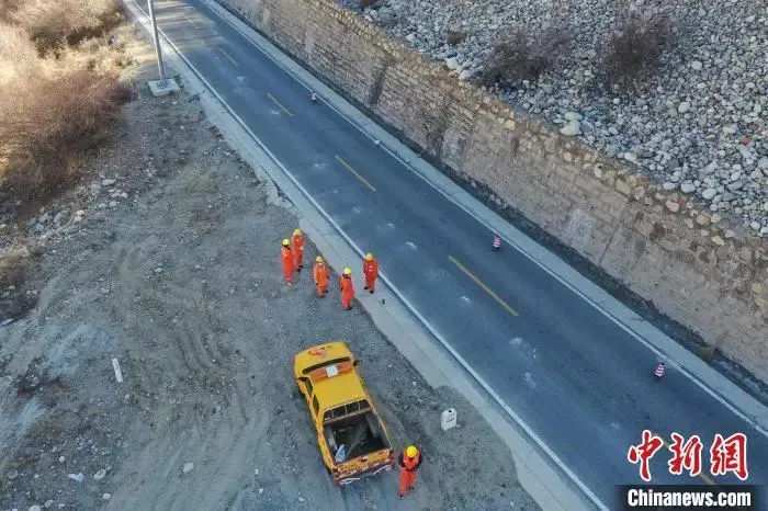 圖為道班工人在公路上巡護(hù)。(無人機(jī)照片)中新社記者 貢嘎來松 攝