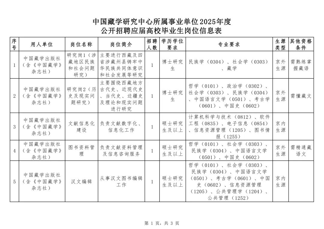 附件:中國藏學(xué)研究中心所屬事業(yè)單位2025年度公開招聘應(yīng)屆高校畢業(yè)生崗位信息表