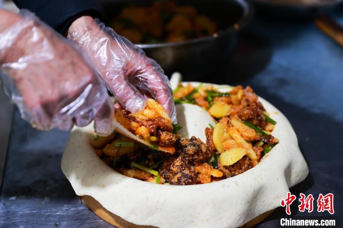 肉質(zhì)鮮嫩的高原牦牛肉被炭火烤至表面金黃、油汁溢出,輔以外焦里糯的高原土豆、撒上蔥花和蒜末增香,用面皮蓋上“被子”,一道色香味俱全的牦牛肉蓋被便完成了。將其切塊并蘸上川味辣椒,一口下去,綿密與脆爽在舌尖混合,蔥蒜與辣椒唇齒留香。