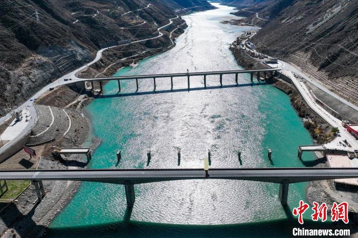 圖為12月21日,川藏交界金沙江上的數(shù)代橋梁。(無人機(jī)畫面)薛蒂 攝