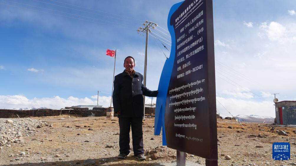 多杰才覺站在麥地卡濕地入園須知牌旁,背后是他升起的國(guó)旗。新華社記者 魏冠宇 攝