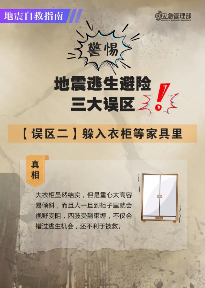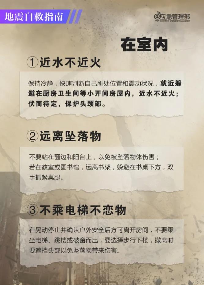 我們要遠(yuǎn)離主墻面、門窗和有高大家具的地方,迅速到衛(wèi)生間、廚房等小開間房間躲避,等晃動(dòng)停止后,再沿消防通道有序疏散,以防后續(xù)余震的影響。疏散時(shí)禁止乘坐電梯,也不提倡在有地震的時(shí)候,利用繩索逃生。