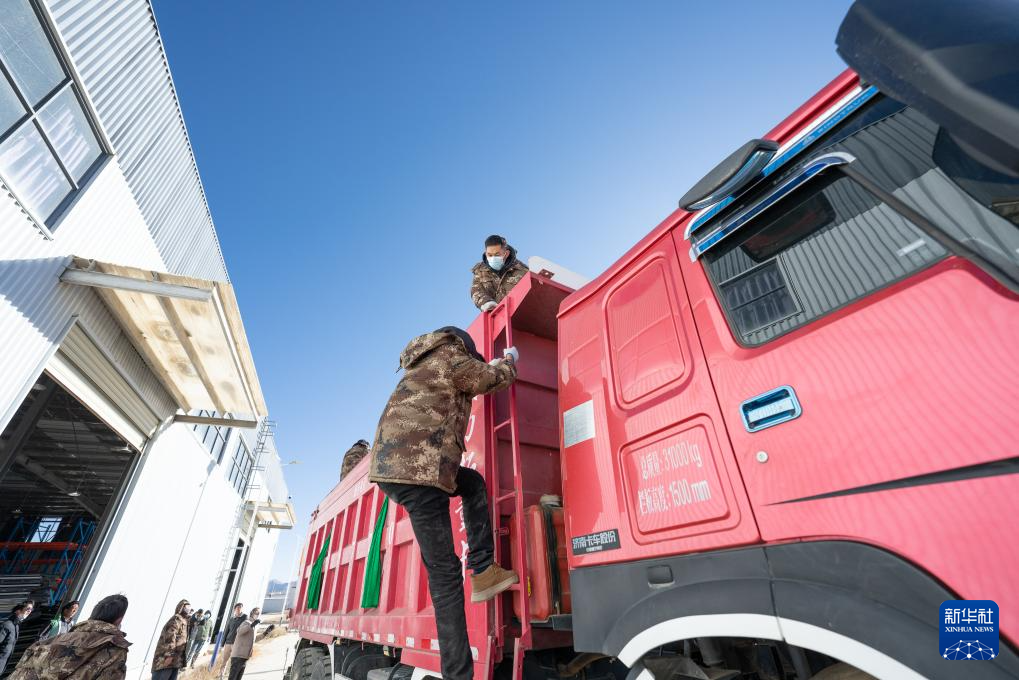 1月8日,在日喀則市境內(nèi)的318國道旁,當?shù)仄髽I(yè)工作人員在用繩子固定抗震救災(zāi)物資。新華社記者 丁增尼達 攝