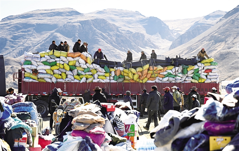1月9日,受災群眾在措布村卸載救災物資。 新華社記者 李響 攝