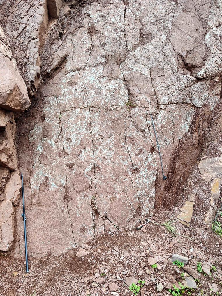 恐龍研究專家、中國地質(zhì)大學(xué)(北京)副教授邢立達(dá)介紹,昌都所在的侏羅紀(jì)地層最大厚度超4800米,產(chǎn)出了大量恐龍足跡化石。2023年7月,中國地質(zhì)調(diào)查局相關(guān)人員在此開展化石遺跡調(diào)查時,意外發(fā)現(xiàn)疑似爬行動物腳印的巖石石壁,后與中國地質(zhì)大學(xué)(北京)展開合作。