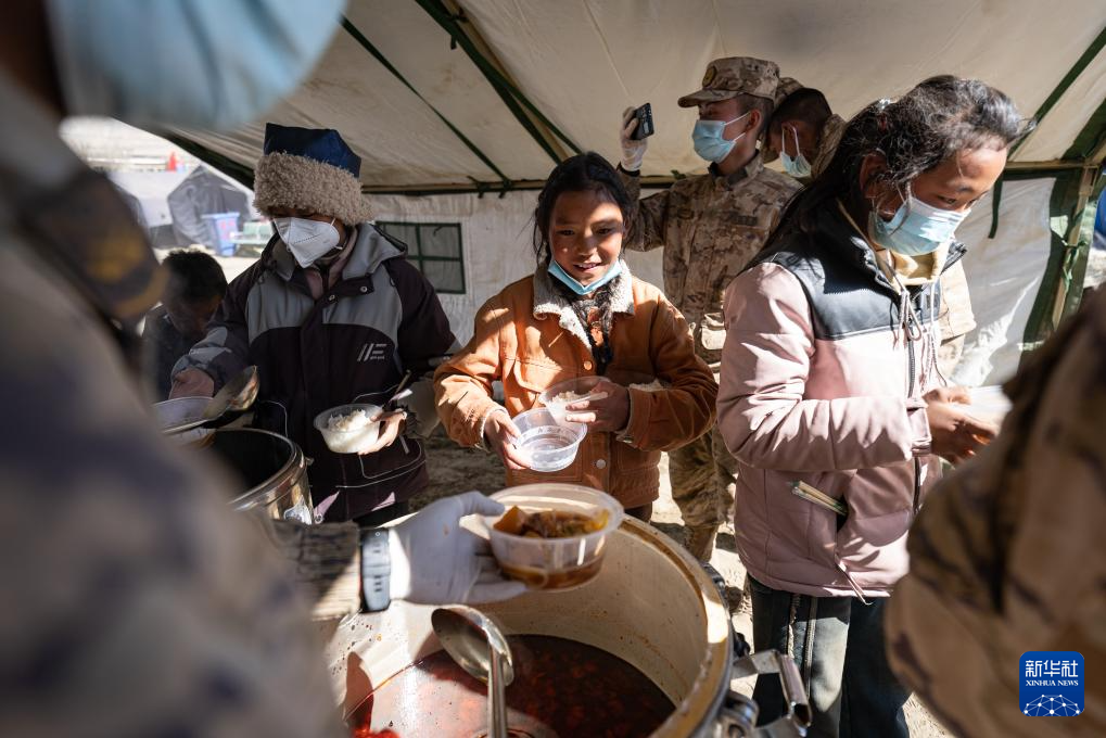 在定日縣長(zhǎng)所鄉(xiāng)森嘎村,群眾在排隊(duì)打飯(1月13日攝)。新華社記者 丁增尼達(dá) 攝