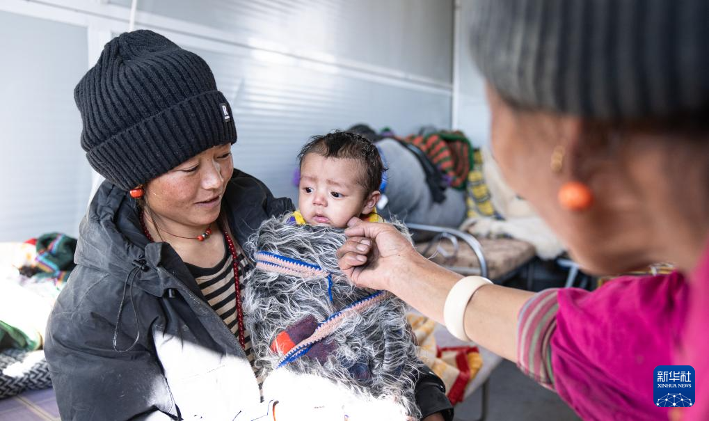 在定日縣長(zhǎng)所鄉(xiāng)嘎旦村的活動(dòng)板房里,一位老人在逗孫子開(kāi)心(1月13日攝)。新華社記者 丁增尼達(dá) 攝
