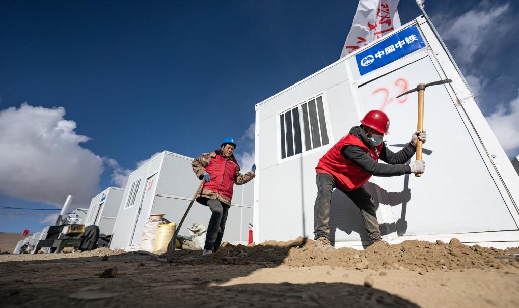 在定日縣長(zhǎng)所鄉(xiāng)嘎旦村,國(guó)家電網(wǎng)工作人員在挖槽預(yù)埋電線(1月13日攝)。新華社記者 丁增尼達(dá) 攝