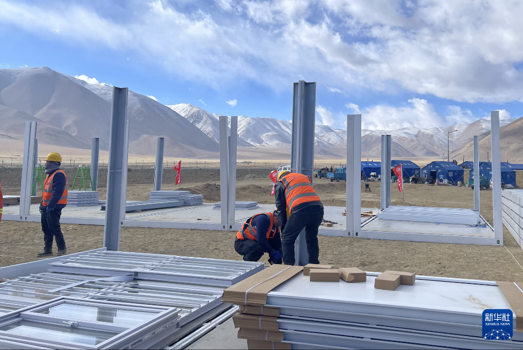 1月13日上午,中鐵二十局工作人員在定日縣措果鄉(xiāng)雪珠村安置點(diǎn)搭建活動(dòng)板房。新華社記者蔣夢(mèng)辰 攝