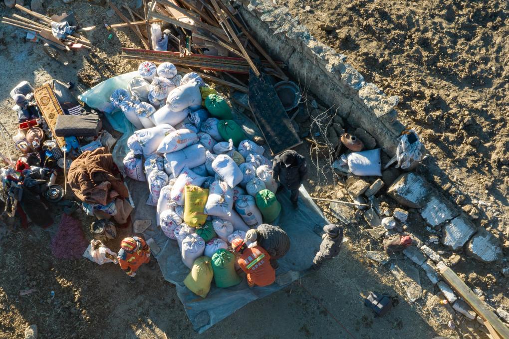 1月13日,在定日縣長(zhǎng)所鄉(xiāng)古榮村,消防員們?cè)谡韽膹U墟中搶救出的青稞(無(wú)人機(jī)照片)。新華社記者丁增尼達(dá) 攝