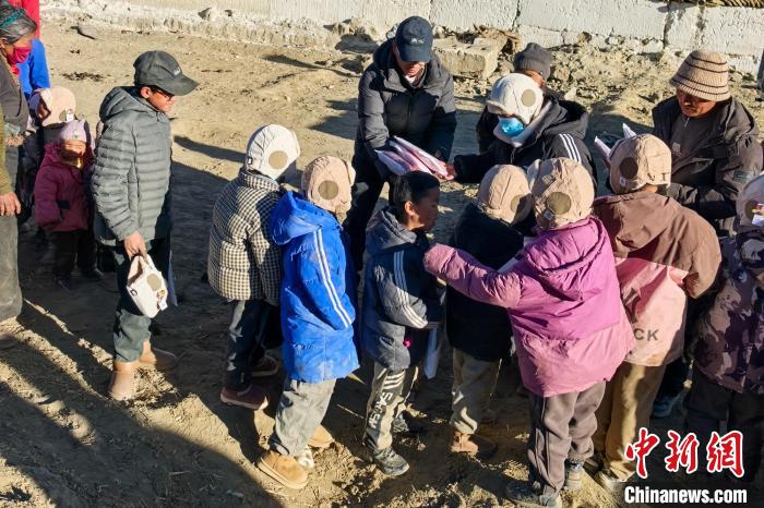 圖為1月12日,桑杰尼瑪將同事們籌款購(gòu)買(mǎi)的保暖帽分發(fā)給村里的孩子們。受訪者 供圖