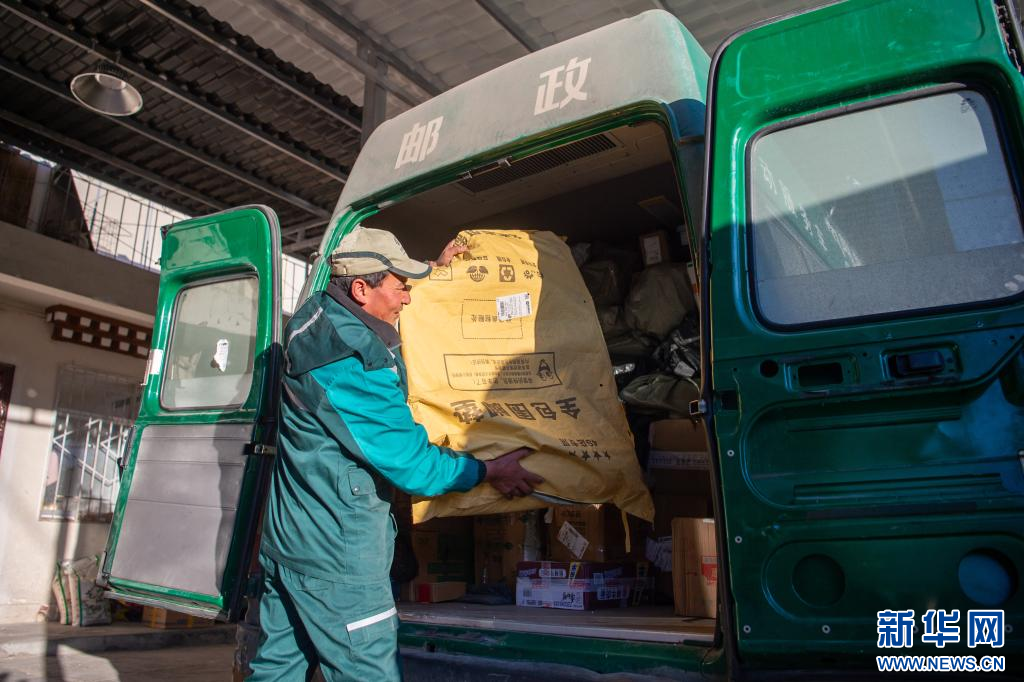 1月19日,在林芝鎮(zhèn)郵政所,郵遞員索朗次仁把準(zhǔn)備派送的快遞裝車(chē)。新華網(wǎng) 旦增努布 攝
