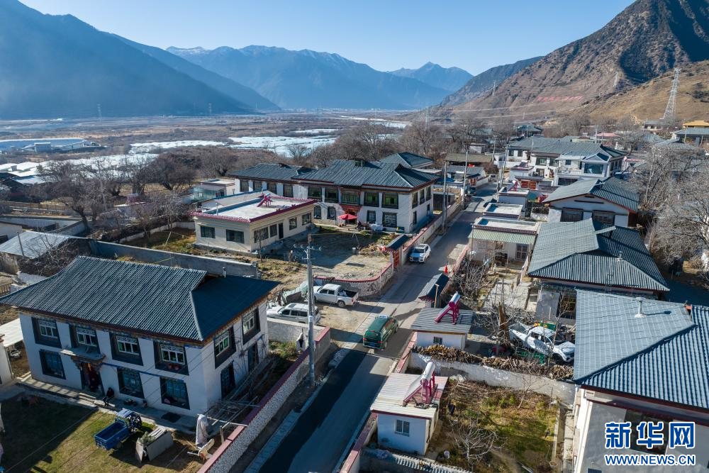 1月19日,西藏林芝市“郵快合作”新配備的郵遞車(chē)穿行在鄉(xiāng)村小巷(無(wú)人機(jī)照片)。新華網(wǎng) 旦增努布 攝