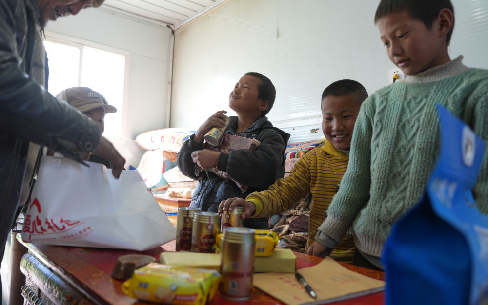 1月27日,加嘎村安置點受災群眾在領(lǐng)取新年大禮包。新華社記者 晉美多吉 攝
