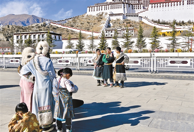 游客在布達(dá)拉宮廣場拍照留念。記者 王敏 攝