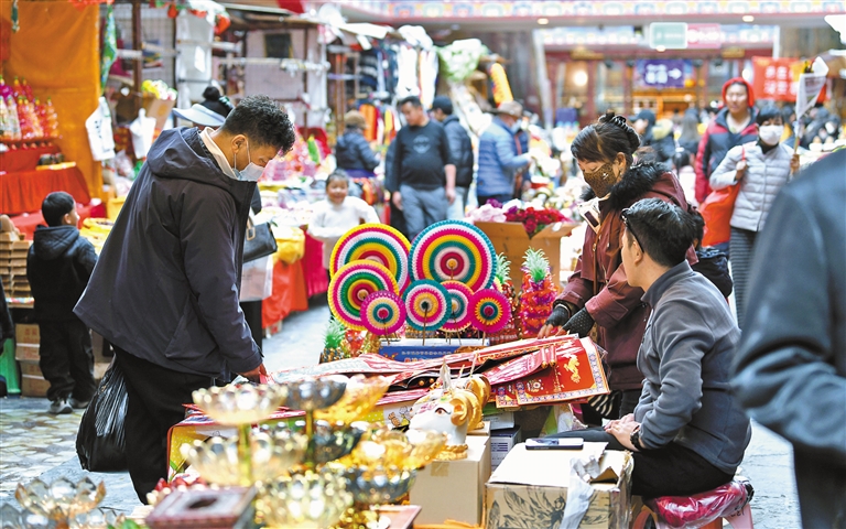 藏歷新年將至,拉薩市大街小巷熱鬧非凡。年貨一條街、超市、商店?duì)幭嗤瞥龈魇侥曦?,各種商品琳瑯滿目,置辦年貨的人摩肩接踵。古城拉薩在歡樂(lè)祥和的氛圍中喜迎藏歷新年。