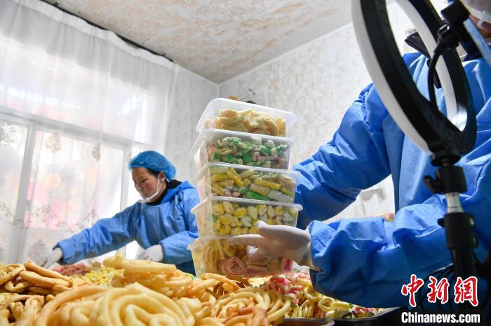 2月10日,西藏拉薩市林廓北路一家卡塞店里,工人在直播賣卡塞?!翱ㄈ笔且环N油炸面食,是藏歷新年必不可少的食物。隨著藏歷新年的日益臨近,古城拉薩各個(gè)加工銷售“卡塞”的店鋪飄出陣陣香味。中新社記者 貢嘎來松 攝