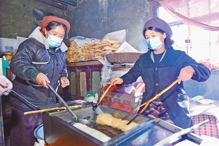 旦索朗一家,在每年藏歷新年前夕,都會開啟一年中最為繁忙的時光——經營“卡賽”生意。旦索朗回憶往昔,感慨萬千:“小時候過年,炸‘卡賽’是家家戶戶的頭等大事,整個村子都彌漫著誘人的香氣,那是新年專屬的味道。如今,時代在變遷,人們的生活方式也發(fā)生了改變,越來越多的人選擇購買成品‘卡賽’,這既契合了快節(jié)奏的現(xiàn)代生活,也為我們提供了發(fā)展的機遇。我們經營‘卡賽’生意已有6年,這期間,靠著誠信經營和對高品質的堅守,生意蒸蒸日上,還帶動了6名村民共同增收,大家一起用雙手創(chuàng)造美好生活?!?/p>