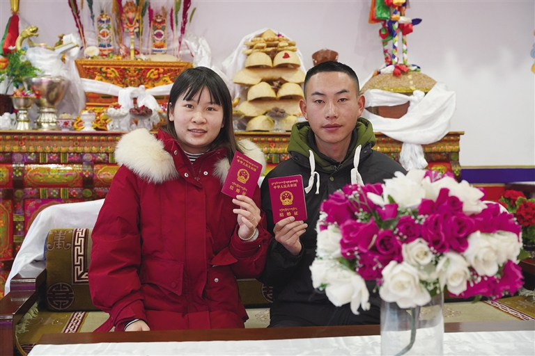 “我們在一起3年了,是表姐牽的紅線?!钡┰龈峦吣樕涎笠缰腋5男θ?,緩緩說道,“初次見到卓嘎,我就對她心生好感。相處一段時(shí)間后,我發(fā)現(xiàn)她性格溫柔,和我特別合拍,于是鼓起勇氣向她表白?!彼_心地展示著剛剛領(lǐng)到的結(jié)婚證,“情人節(jié)是個(gè)好日子,我們早就計(jì)劃好今天領(lǐng)證,現(xiàn)在終于如愿以償。以后情人節(jié)和結(jié)婚紀(jì)念日合二為一,既能少買一份禮物,也不用擔(dān)心忘記啦。”