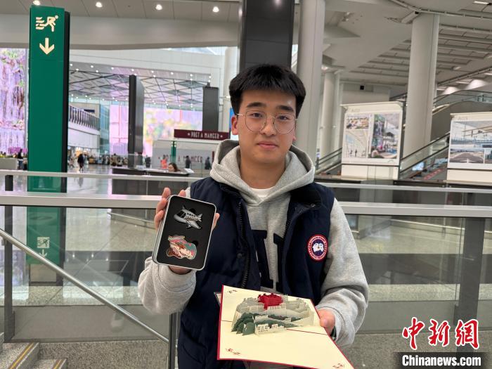 2月19日,西藏航空“拉薩-成都天府-香港”航線開通。圖為首航乘客曾帥向記者展示航空公司派發(fā)的首航紀(jì)念徽章和立體賀卡。中新社記者 韓星童 攝
