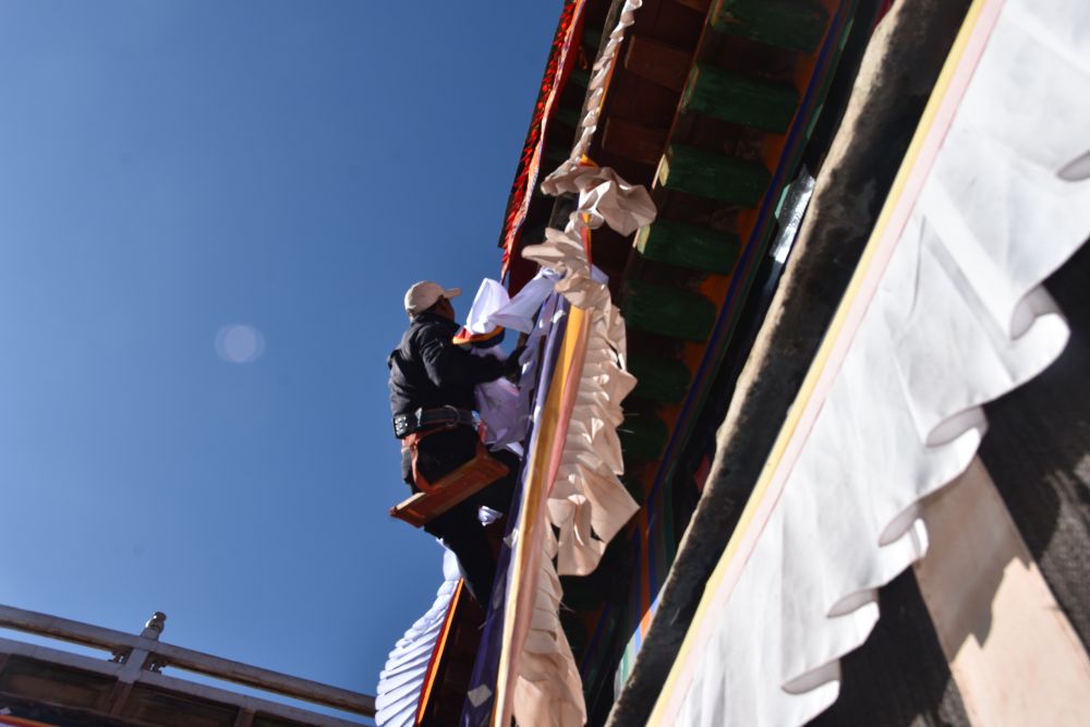 “布達拉宮門窗眾多,需要更換總長近1萬米的‘香布’及數(shù)百個門簾、窗簾等?!辈歼_拉宮管理處維修科科長扎西平措介紹,為確保在藏歷新年前完成所有工作,管理處根據(jù)往年慣例提前10天左右開始更換作業(yè)。