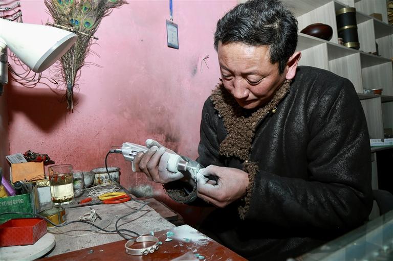 “叮叮當(dāng)當(dāng)……”近日,記者走進(jìn)墨竹工卡縣尼瑪江熱鄉(xiāng)宗雪村,被一陣短促而有力的敲打聲吸引。循聲而入,記者來到恰扎飾品加工店,展示架上琳瑯滿目的首飾讓人目不暇接:阿吉祖玉、銀手鐲、銀戒指、銀碗……