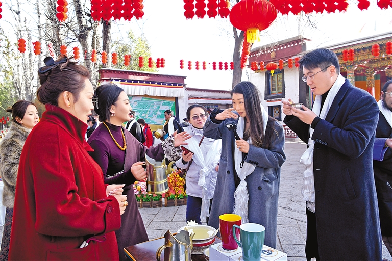 隨著一聲聲“扎西德勒!”“新年快樂(lè)!”的祝福語(yǔ)響起,身著盛裝的工作人員站在切瑪盒旁邊,熱情地教游客吃“切瑪”?!扒鞋敗焙欣餄M滿的青稞粒和糌粑,再加上金燦燦的酥油花和染成紅綠兩色的“羅薩梅朵”麥穗的裝點(diǎn),象征著五谷豐登、福澤綿長(zhǎng)。來(lái)自廣東的游客張女士一家是專(zhuān)程趕來(lái)過(guò)藏歷新年的,想來(lái)體驗(yàn)不同年味兒的她輕捏一撮切瑪撒向空中:“愿我們?nèi)医】灯桨?,也祝祖?guó)繁榮昌盛!”