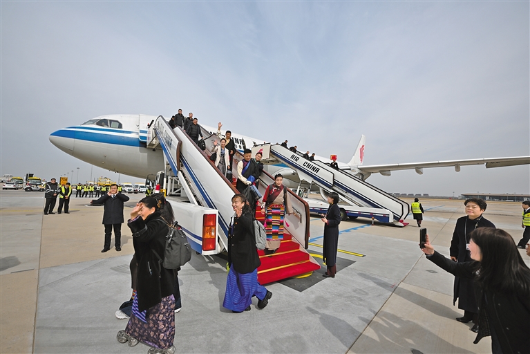 圖為西藏參加全國(guó)兩會(huì)的代表委員乘機(jī)抵達(dá)北京。 記者 旦增西旦 攝