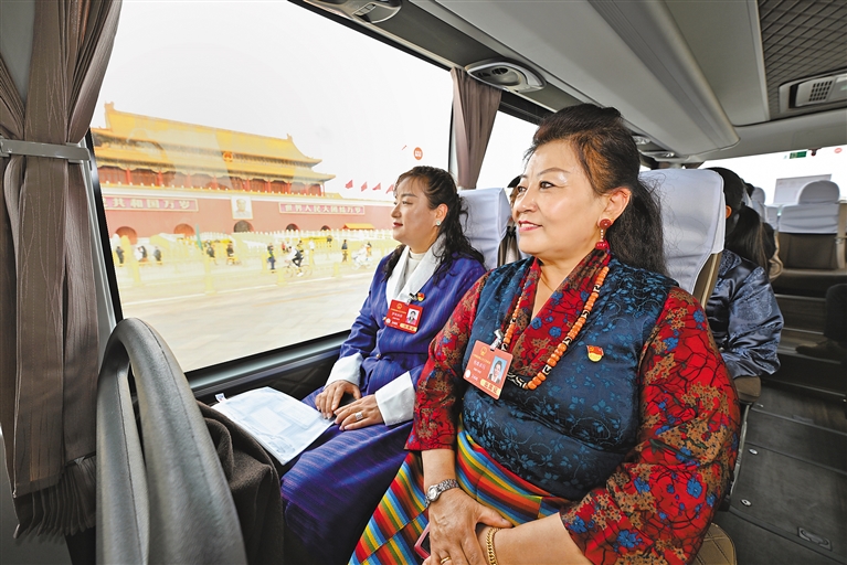 圖為人大代表們乘車(chē)前往駐地的途中經(jīng)過(guò)天安門(mén)廣場(chǎng)。 記者 旦增西旦 攝