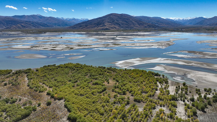 這是雅魯藏布江寬闊的河床和岸邊種植的樹(shù)木(2024年10月24日攝)。新華社記者 晉美多吉 攝