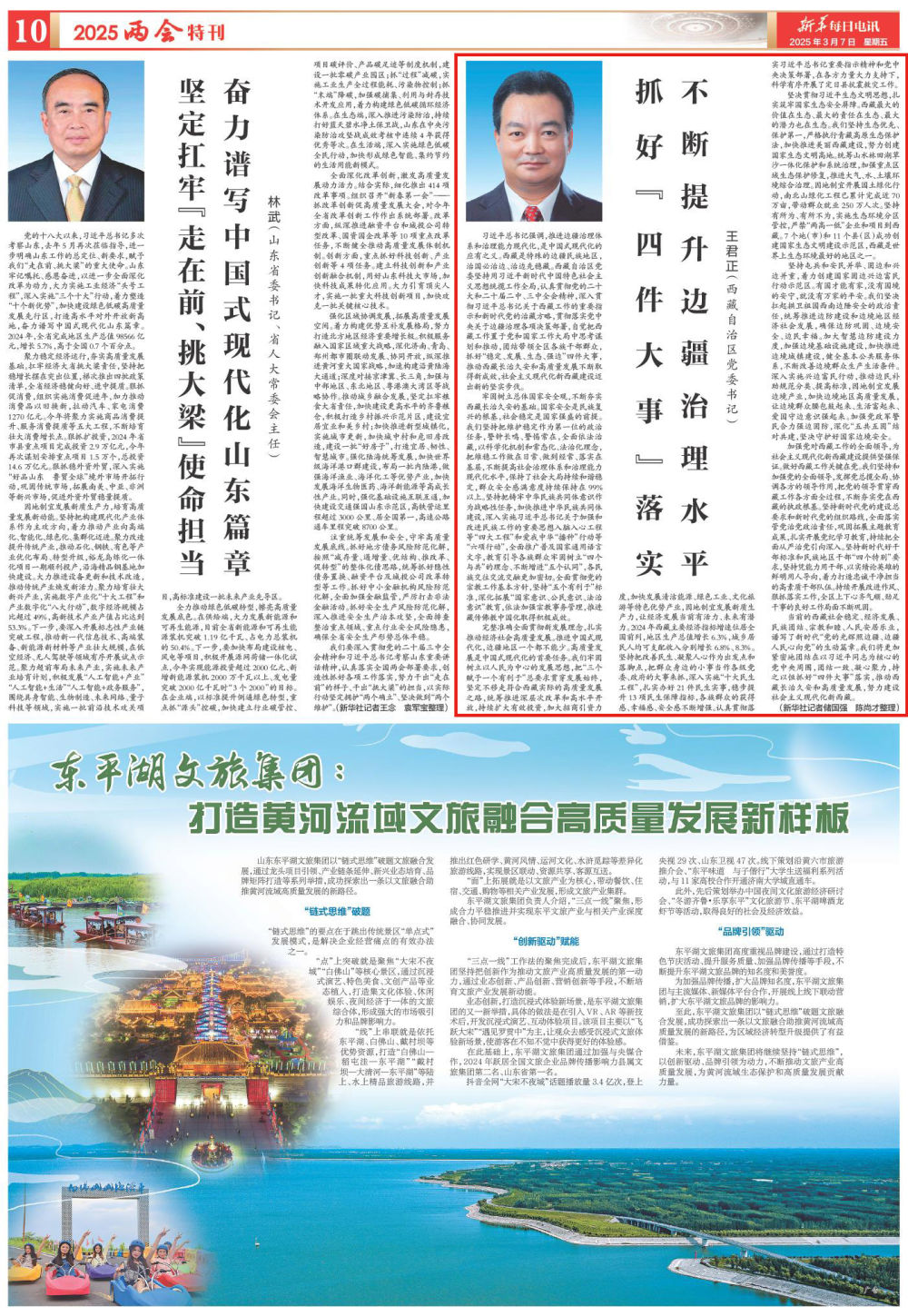 完整準(zhǔn)確全面貫徹新發(fā)展理念,扎實(shí)推動(dòng)經(jīng)濟(jì)社會(huì)高質(zhì)量發(fā)展。推進(jìn)中國(guó)式現(xiàn)代化,邊疆地區(qū)一個(gè)都不能少。高質(zhì)量發(fā)展是中國(guó)式現(xiàn)代化的首要任務(wù)。我們牢固樹(shù)立以人民為中心的發(fā)展思想,把“三個(gè)賦予一個(gè)有利于”總要求貫穿發(fā)展始終,堅(jiān)定不移走符合西藏實(shí)際的高質(zhì)量發(fā)展之路,統(tǒng)籌推進(jìn)深層次改革和高水平開(kāi)放,持續(xù)擴(kuò)大有效投資,加大招商引資力度,加快發(fā)展清潔能源、綠色工業(yè)、文化旅游等特色優(yōu)勢(shì)產(chǎn)業(yè),因地制宜發(fā)展新質(zhì)生產(chǎn)力,讓經(jīng)濟(jì)發(fā)展當(dāng)前有活力、未來(lái)有潛力。2024年西藏主要經(jīng)濟(jì)指標(biāo)增速位居全國(guó)前列,地區(qū)生產(chǎn)總值增長(zhǎng)6.3%,城鄉(xiāng)居民人均可支配收入分別增長(zhǎng)6.8%、8.3%。堅(jiān)持把改善民生、凝聚人心作為出發(fā)點(diǎn)和落腳點(diǎn),把群眾身邊的小事當(dāng)作各級(jí)黨委、政府的大事來(lái)抓,深入實(shí)施“十大民生工程”,扎實(shí)辦好21件民生實(shí)事,穩(wěn)步提升13項(xiàng)民生保障指標(biāo),各族群眾的獲得感、幸福感、安全感不斷增強(qiáng)。認(rèn)真貫徹落實(shí)習(xí)近平總書(shū)記重要指示精神和黨中央決策部署,在各方力量大力支持下,科學(xué)有序開(kāi)展了定日縣抗震救災(zāi)工作。