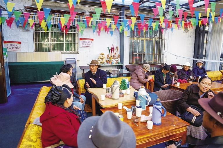 “波啦,您來啦,快坐下來喝點(diǎn)熱茶?!薄澳?,待會午飯?jiān)谶@邊吃嗎?”近日,記者來到拉薩市城關(guān)區(qū)蕃陽社會工作者和志愿者服務(wù)協(xié)會下的策門林老年日間照料中心,剛進(jìn)大門就被一群正在鍛煉身體的老人所吸引。他們跟著老師抬手、踢腿、扭腰,動作整齊劃一,臉上洋溢著幸福的笑容。鍛煉結(jié)束后,赤來回到助餐區(qū),邊喝甜茶邊吃“卡賽”,和老人們分享趣聞,拉著家常,現(xiàn)場傳來一陣陣歡聲笑語。