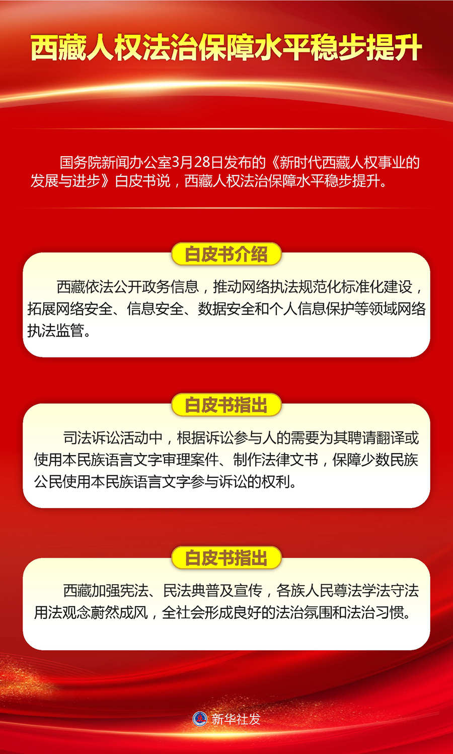 國務(wù)院新聞辦公室28日發(fā)布的《新時代西藏人權(quán)事業(yè)的發(fā)展與進步》白皮書說,西藏人權(quán)法治保障水平穩(wěn)步提升。