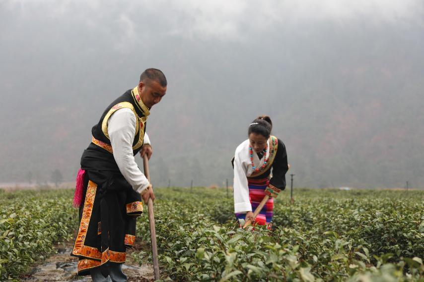 作品簡介:拍攝于2022年3月松古村茶園,兩位身著藏服的茶農(nóng)正在茶地里辛勤勞作。