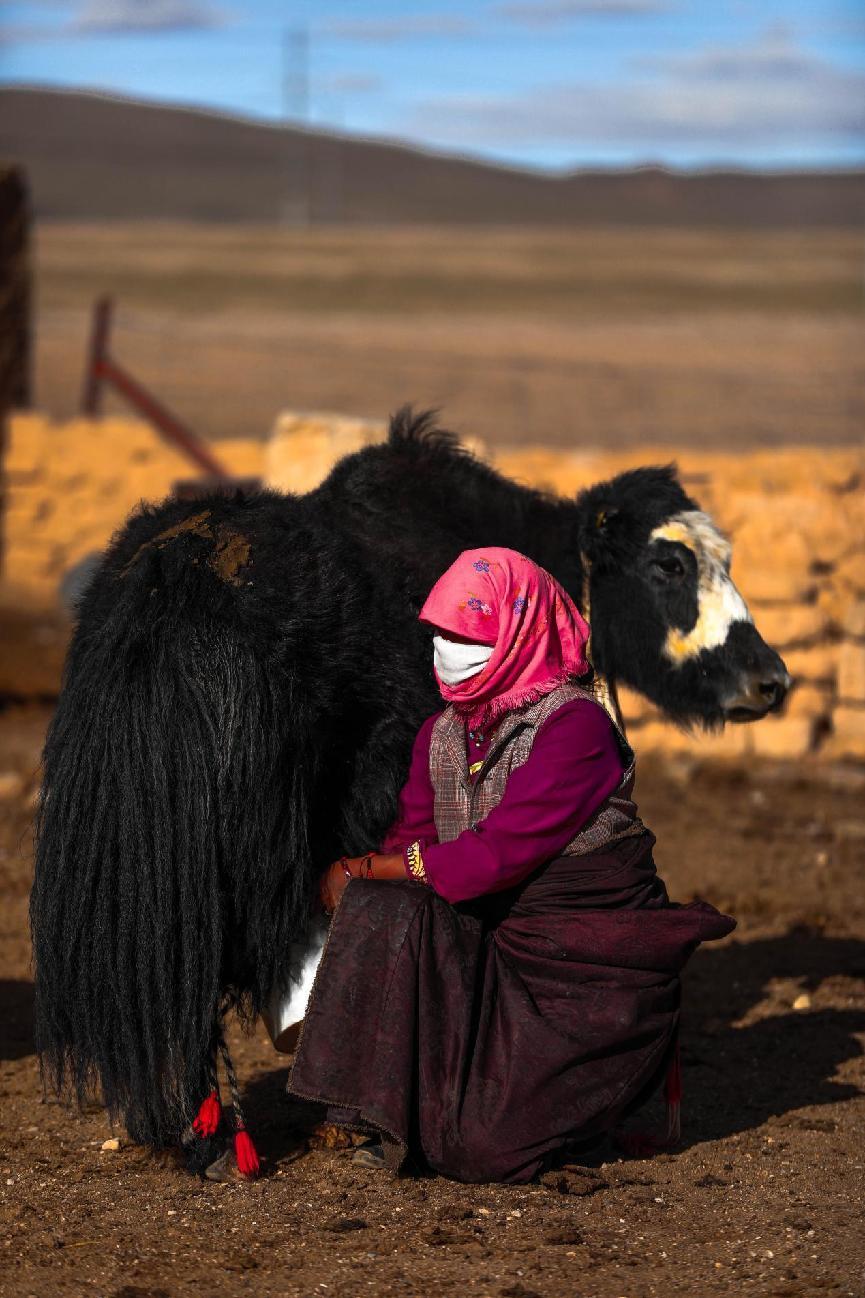 作品簡介:一位牧女戴著紅色頭巾與白色面罩,半蹲著給牦牛擠奶。
