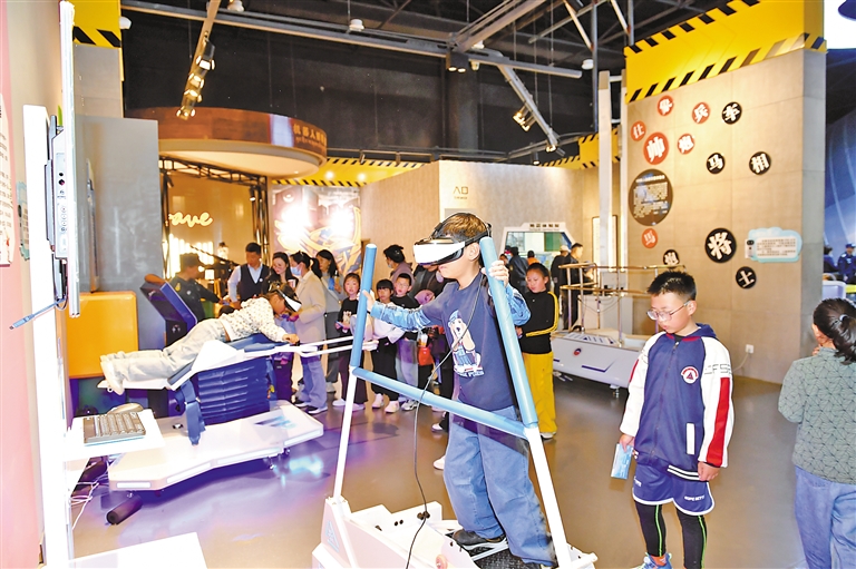 小朋友們?cè)谖鞑刈匀豢茖W(xué)博物館內(nèi)體驗(yàn)VR設(shè)備。