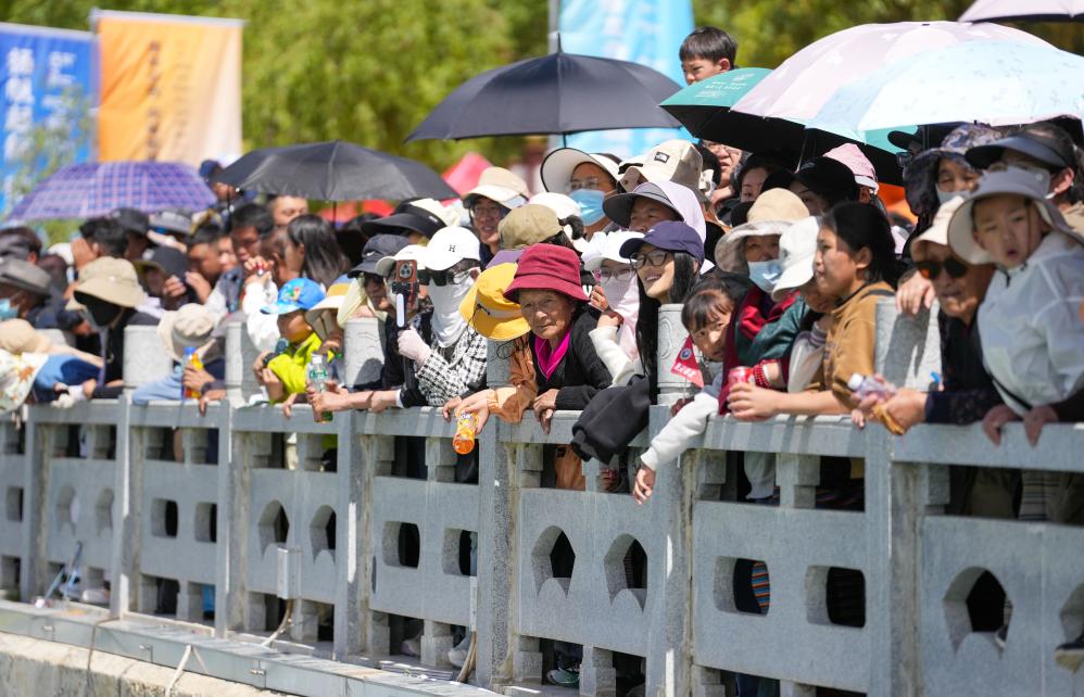 ↑5月31日,觀眾在拉薩市濱河公園岸邊觀看西藏自治區(qū)端午節(jié)牛皮船(龍舟)賽。新華社記者 晉美多吉 攝