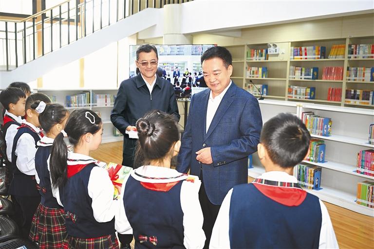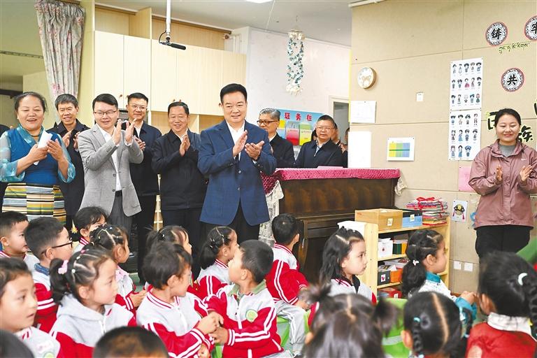 初夏,萬(wàn)物并秀,生機(jī)勃發(fā),拉薩市實(shí)驗(yàn)小學(xué)書聲瑯瑯。王君正走進(jìn)校園,察看學(xué)校環(huán)境,參觀自然、閱讀、書法、體育等教育成果展示,了解學(xué)校歷史沿革、建設(shè)發(fā)展、教育教學(xué)等情況。他指出,習(xí)近平總書記高度重視、親切關(guān)懷少年兒童和少先隊(duì)工作,多次參加少先隊(duì)活動(dòng),發(fā)表重要講話、作出重要指示。5月27日,習(xí)近平總書記致信祝賀中國(guó)少年先鋒隊(duì)第九次全國(guó)代表大會(huì)召開(kāi),殷切寄語(yǔ)廣大少年兒童,飽含著對(duì)大家的深切關(guān)愛(ài)。要加強(qiáng)愛(ài)國(guó)主義教育,講好思政課,著力講好黨的故事、革命的故事、英雄的故事,時(shí)刻把祖國(guó)和人民放在心中,不忘初心、童心向黨,從小聽(tīng)黨話、感黨恩、跟黨走;要積極推廣國(guó)家通用語(yǔ)言文字,把鑄牢中華民族共同體意識(shí)根植少年兒童心靈深處,引導(dǎo)他們爭(zhēng)做民族團(tuán)結(jié)的小石榴籽,爭(zhēng)當(dāng)學(xué)習(xí)和踐行社會(huì)主義核心價(jià)值觀的小模范。圖書館內(nèi),“紅領(lǐng)巾小書蟲”讀書分享活動(dòng)正在進(jìn)行,孩子們圍坐在一起,與定日縣長(zhǎng)所鄉(xiāng)完全小學(xué)學(xué)生視頻連線,共同分享喜歡的書籍,王君正認(rèn)真傾聽(tīng)、親切詢問(wèn),向孩子們贈(zèng)送書籍。“祖國(guó)的未來(lái)和希望在你們身上,要熱愛(ài)祖國(guó)、好好學(xué)習(xí)、天天向上,從小培養(yǎng)良好的道德情操。”王君正鼓勵(lì)他們說(shuō),要多讀書、讀好書,從書中汲取智慧和營(yíng)養(yǎng),將來(lái)做對(duì)國(guó)家、對(duì)人民、對(duì)社會(huì)有用的人。