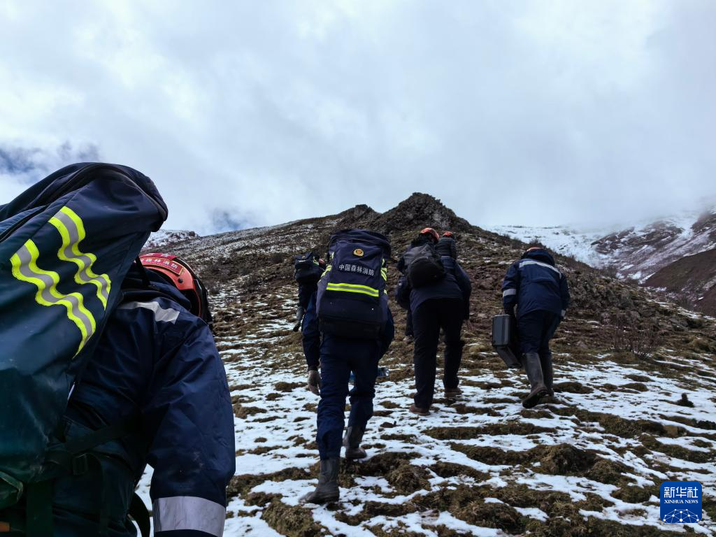 這是6月3日拍攝的森林消防戰(zhàn)士陪同專家組前往現(xiàn)場(chǎng)勘測(cè)。新華社發(fā)