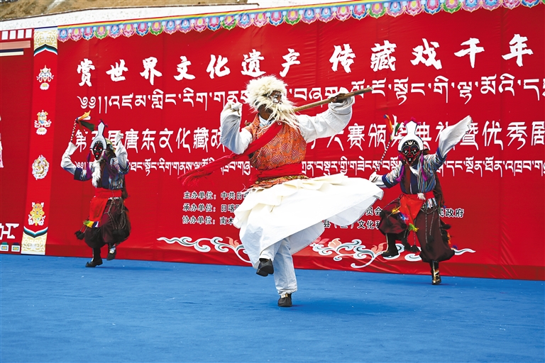 第五屆唐東文化藏戲(折子戲)大賽決賽上,參賽隊伍正在表演。