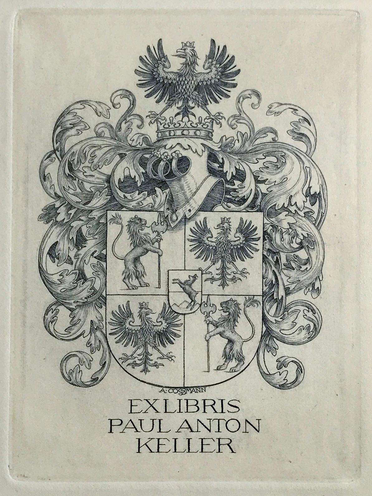 何為民收藏的紋章藏書票,作者是奧地利版畫家阿爾弗雷德-科斯曼 (Alfred Cossmann 1870-1951) 。受訪者供圖