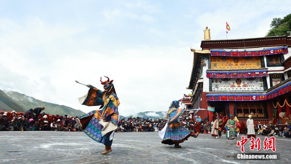 近日,西藏自治區(qū)拉薩市墨竹工卡縣直孔替寺舉行中國國家級非物質(zhì)文化遺產(chǎn)直孔嘎爾羌姆(跳神)活動。直孔嘎爾羌姆是藏傳佛教重要的宗教舞蹈藝術(shù)形式,“嘎爾”意為“樂舞”。其表演具有規(guī)范化的舞蹈動作、獨特的伴奏音樂和完整的儀軌流程。圖為西藏拉薩市墨竹工卡縣直孔替寺僧人們佩戴面具參加跳神活動。