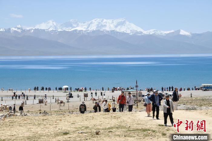 6月26日,隨著氣溫逐漸升高,西藏納木錯迎來旅游旺季。納木錯,藏語意為“天湖”,位于西藏自治區(qū)中部,拉薩市當雄縣和那曲市班戈縣之間,面積超2000平方公里,湖面海拔4718米,是世界海拔最高的大型咸水湖。圖為游客在納木錯湖邊拍照留念。中新社記者 貢嘎來松 攝