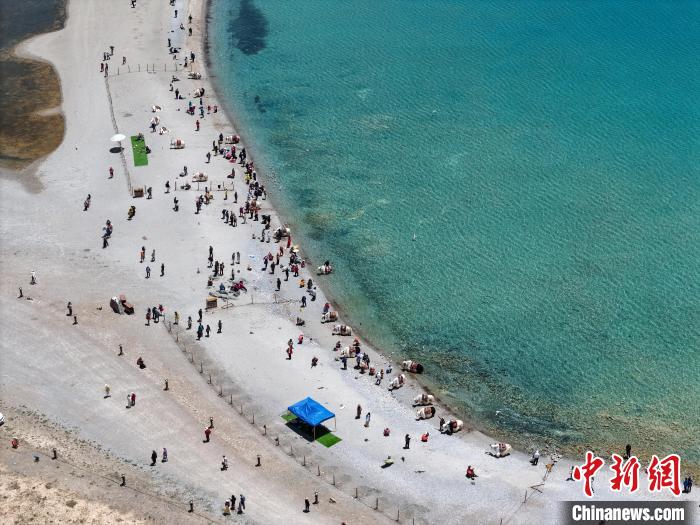 圖為游客在納木錯湖邊游玩。(無人機照片)中新社記者 貢嘎來松 攝