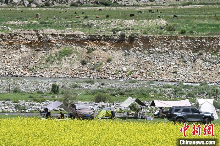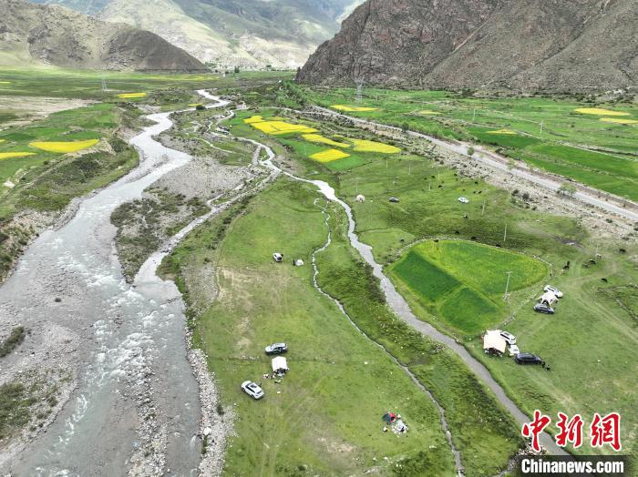 7月5日,西藏拉薩市風和日麗,宜人周末里,市民紛紛前往近郊“過林卡”。在堆龍德慶區(qū)古榮鎮(zhèn)楚布溝,帳篷林立,歡聲笑語不斷。人們圍坐野餐,享受美食,伴著高原美景談天歌唱,孩童嬉戲奔跑,在自然中放松身心,延續(xù)傳統(tǒng)休閑樂趣 。圖為市民在楚布溝里“過林卡”。(無人機照片)中新社記者 貢嘎來松 攝