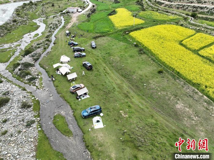 圖為市民在楚布溝里“過林卡”。(無人機照片)中新社記者 貢嘎來松 攝